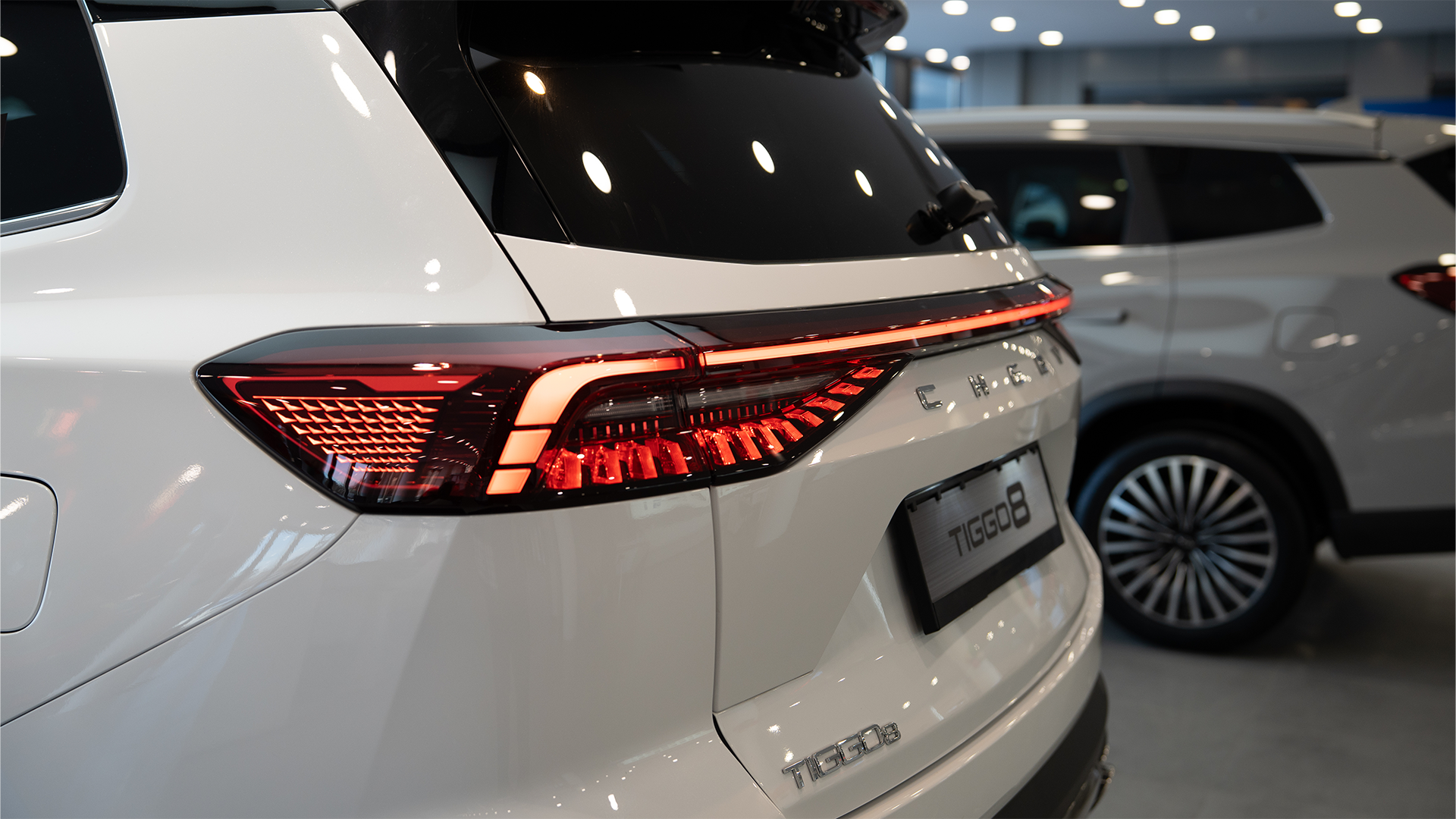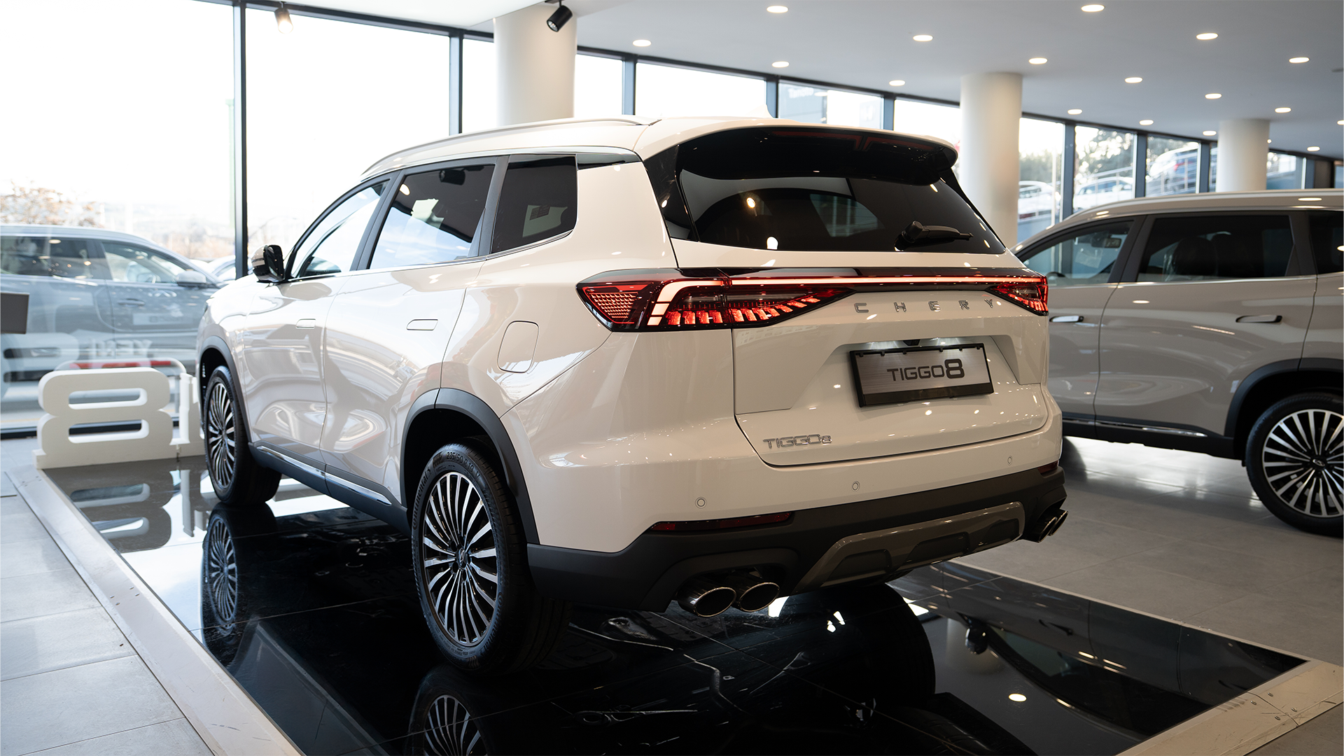 Tiggo 8, dış tasarımında, elmas tasarımlı ön ızgara, AmberFlare LED ön farlar ve Tiger Pulse LED arka stop lambaları ile güçlü SUV karakterini tamamlar. 1365 mm x 840 mm boyutlarındaki açılabilir panoramik cam tavan, iç mekâna maksimum gün ışığı alarak ferah bir atmosfer yaratır. İç tasarım detaylarında ise kahverengi deri yumuşak koltuklar, 64 renkli ambiyans aydınlatma, yüksek yalıtım seviyesi ve premium yüzey dokuları ile lüks bir yaşam alanı oluşturur. Standart 7 kişilik oturma düzeni, geniş aileler için üst düzey kullanım avantajı sunar.